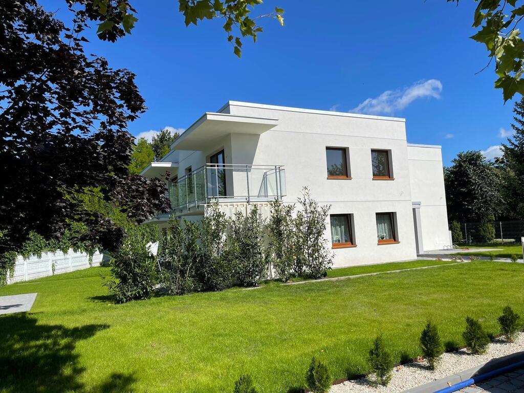 - Nowoczesne rozwiązania architektoniczne – elegancka bryła budynku z dużymi ogrodami na parterze i balkonami na piętrze